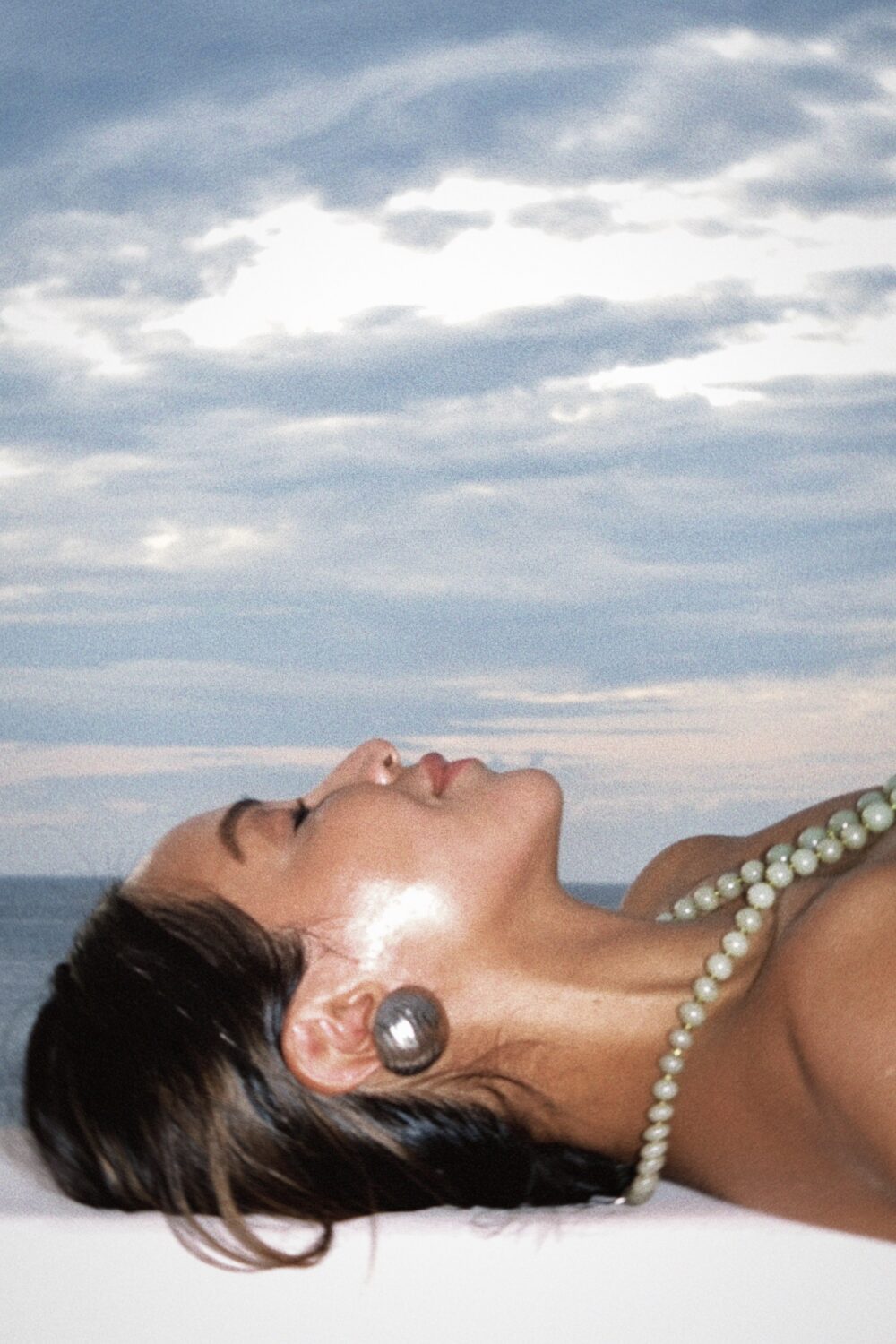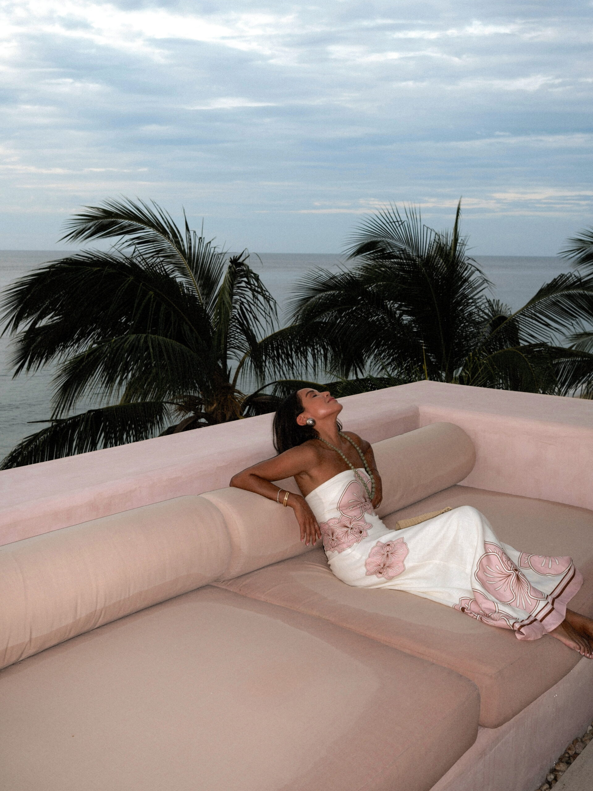 The pink floral design perfectly matched the tones of the house, and I accessorized with a bold sage-green beaded necklace for a fun pop of contrast. I finished the look with statement earrings and a woven bag to keep things relaxed. We ended the night watching the sunset from our beach house terrace—a perfect end to a perfect day.