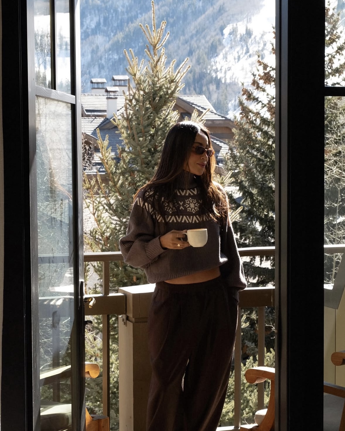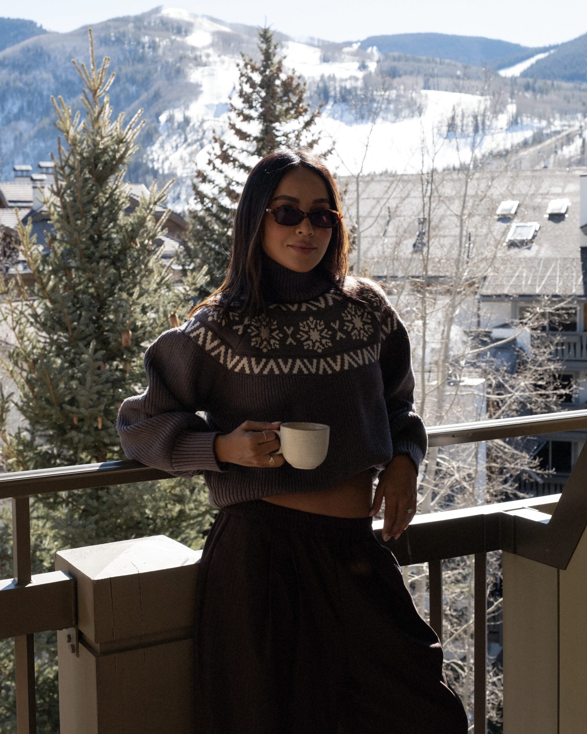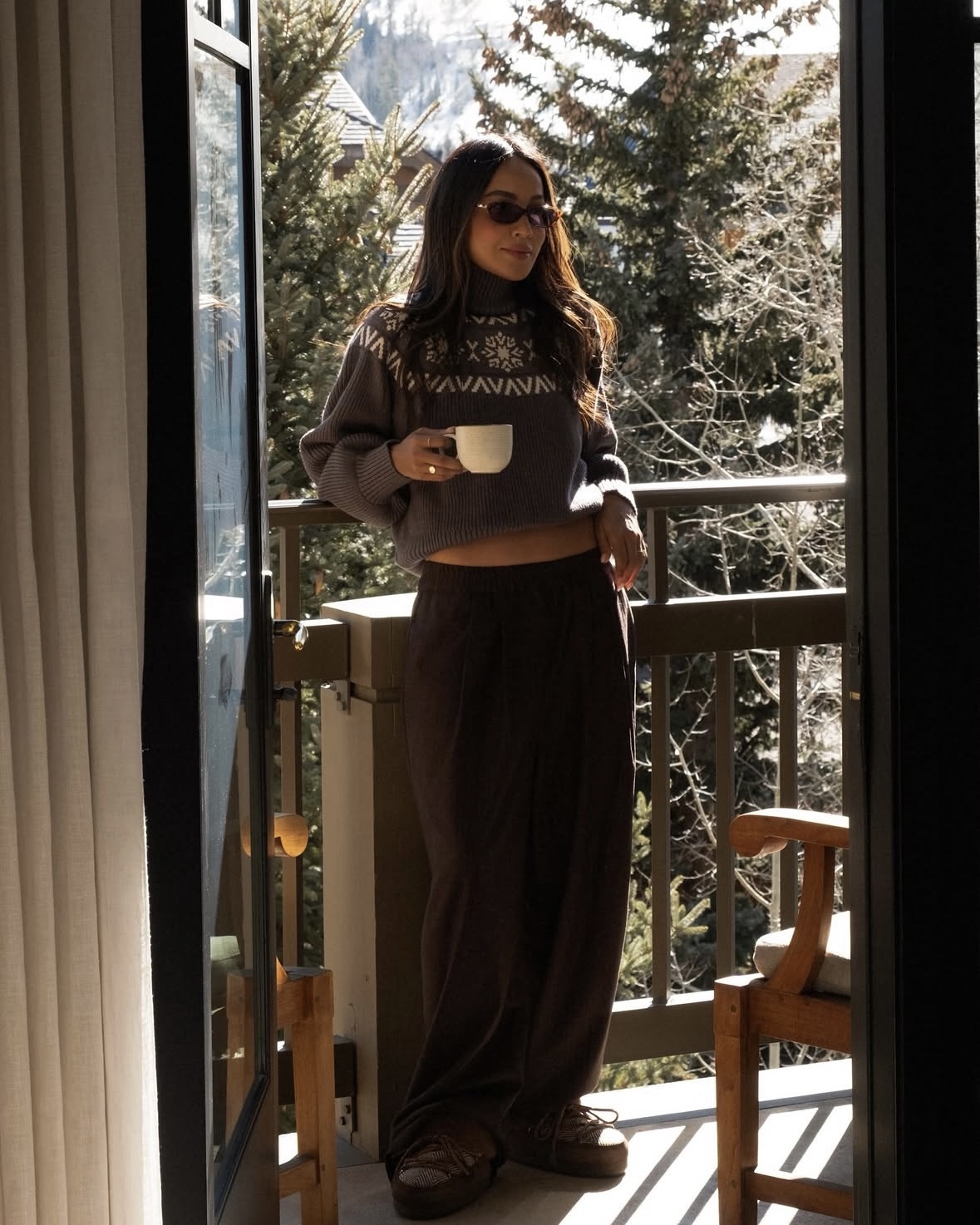 It’s also the perfect excuse to lean into a cozy but put-together look — something that feels as good as it looks. Think a soft turtleneck knit (even better with a subtle alpine feel), oversized trousers, and cozy snow boots. Add a statement faux fur coat to pull everything together, then finish it off with sleek sunnies and a few simple jewelry pieces. Easy, effortless, and perfect for a quick photo moment with the mountains in the background.