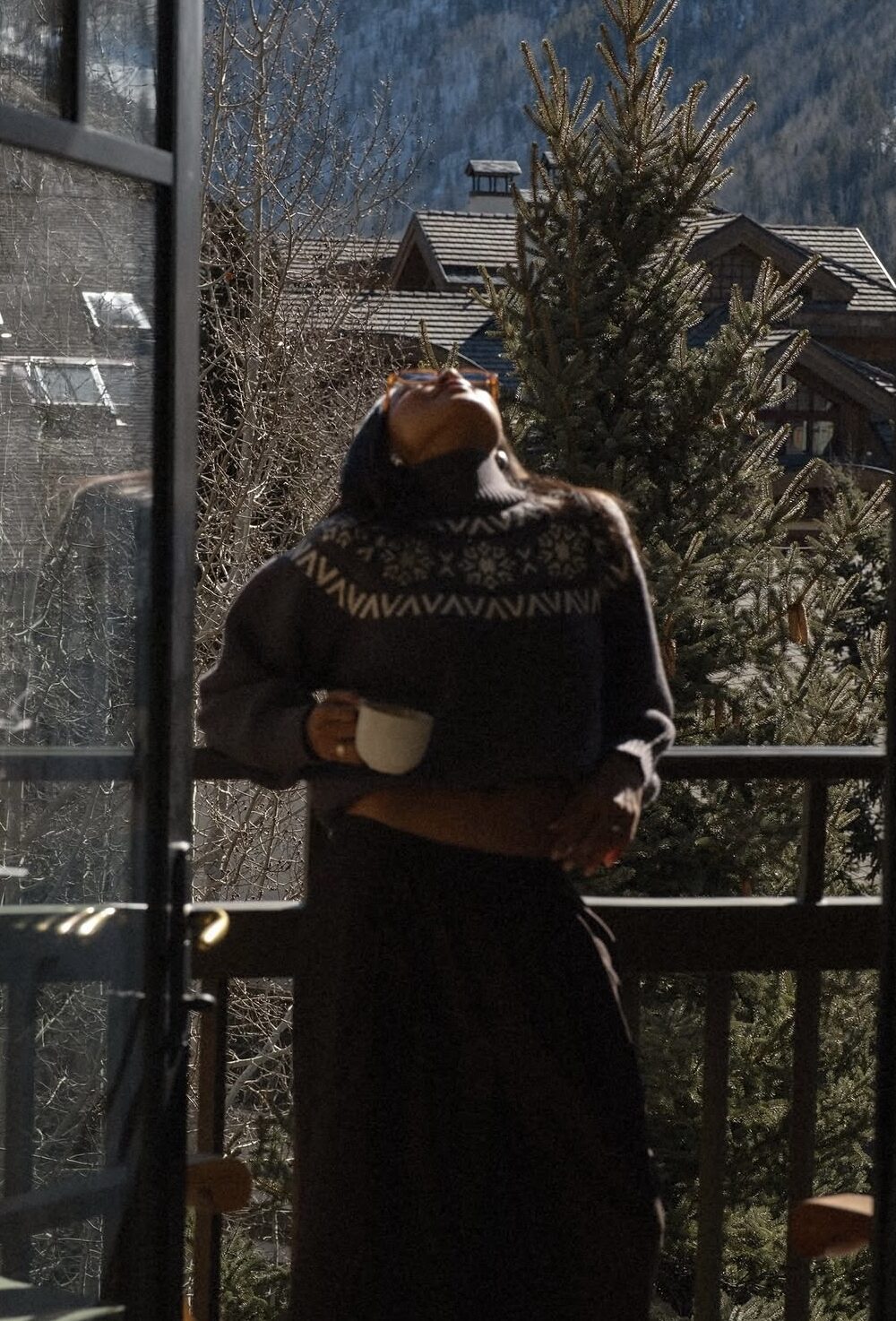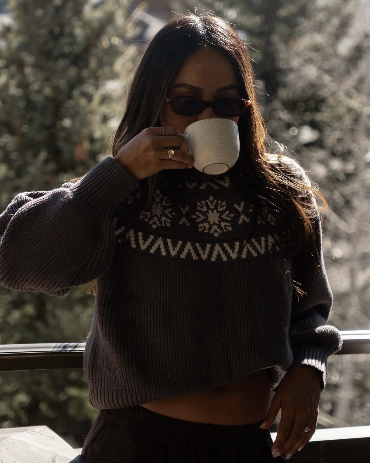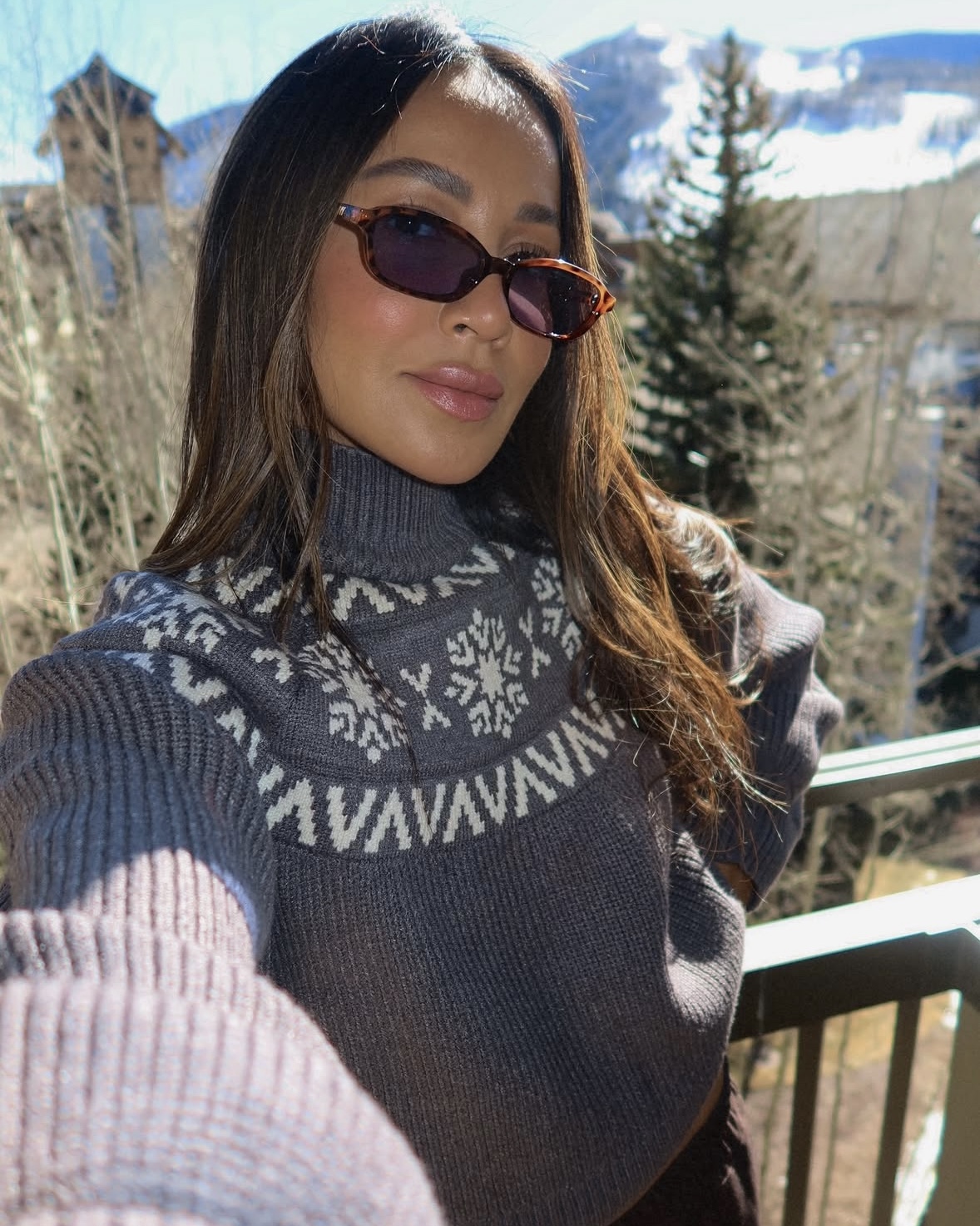 It’s also the perfect excuse to lean into a cozy but put-together look — something that feels as good as it looks. Think a soft turtleneck knit (even better with a subtle alpine feel), oversized trousers, and cozy snow boots. Add a statement faux fur coat to pull everything together, then finish it off with sleek sunnies and a few simple jewelry pieces. Easy, effortless, and perfect for a quick photo moment with the mountains in the background.
