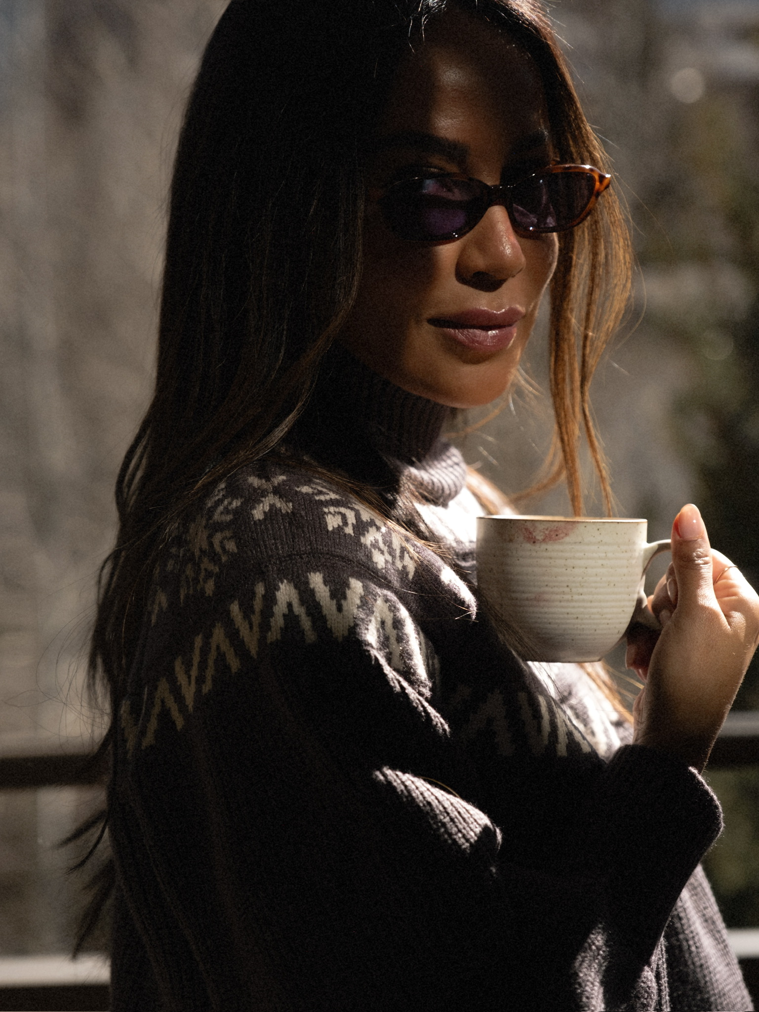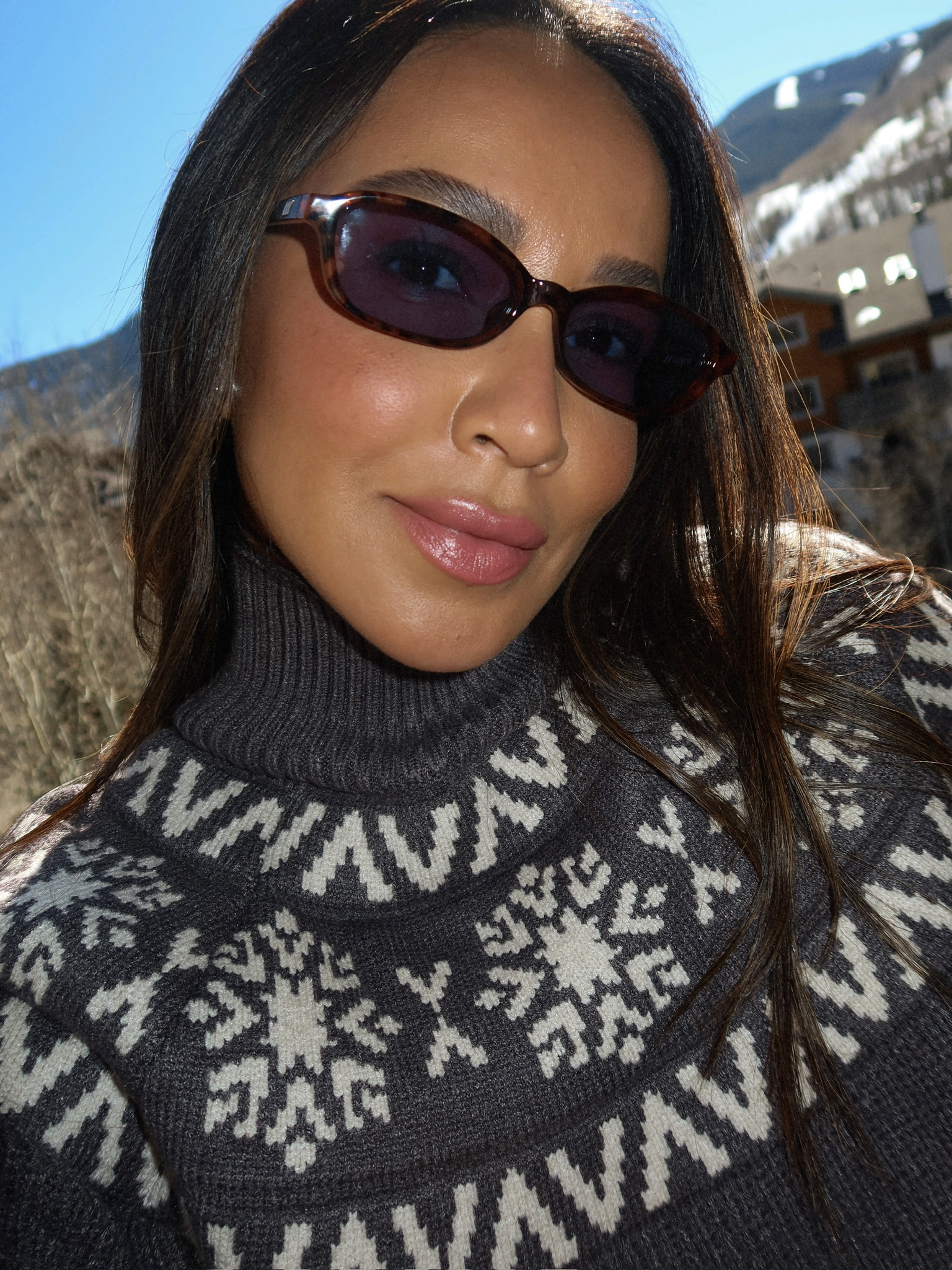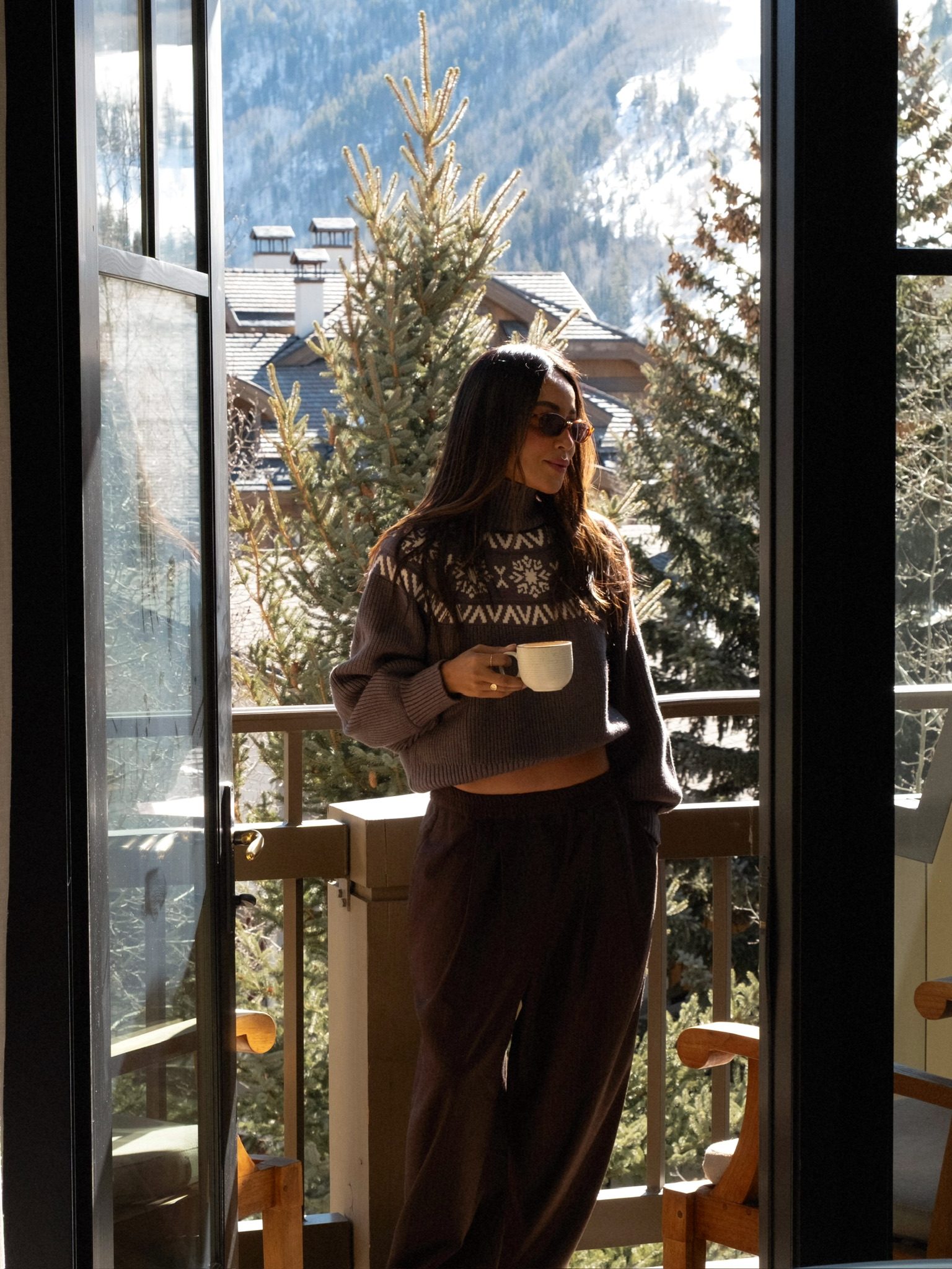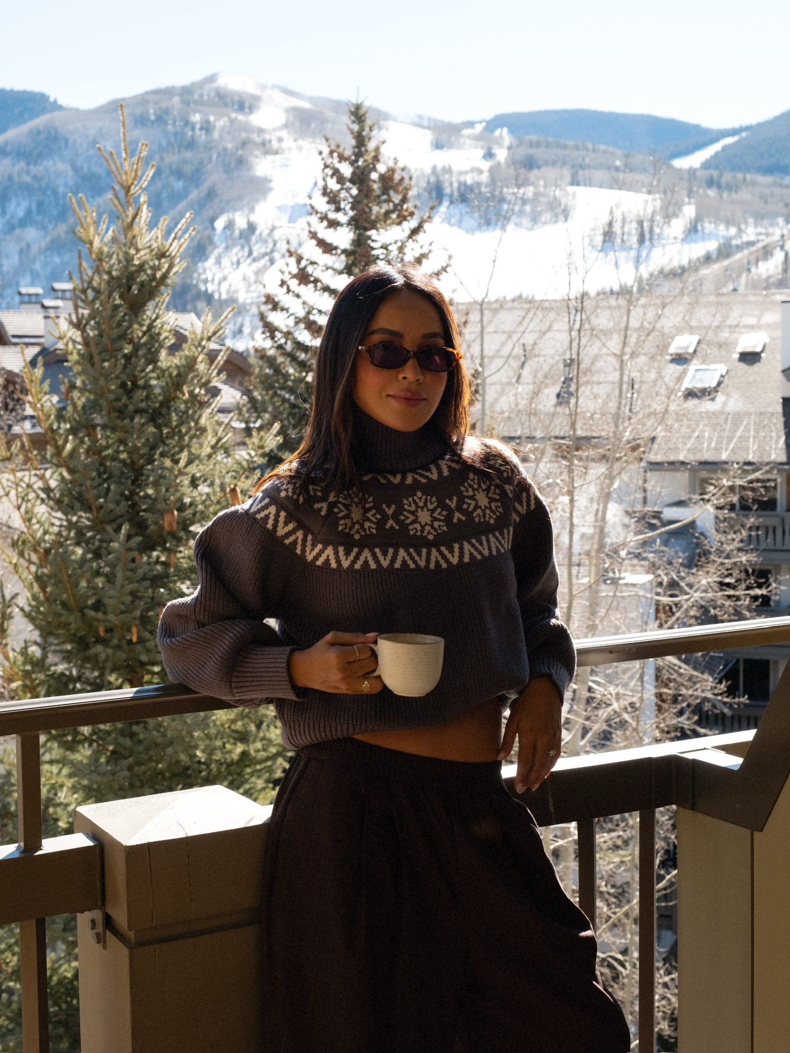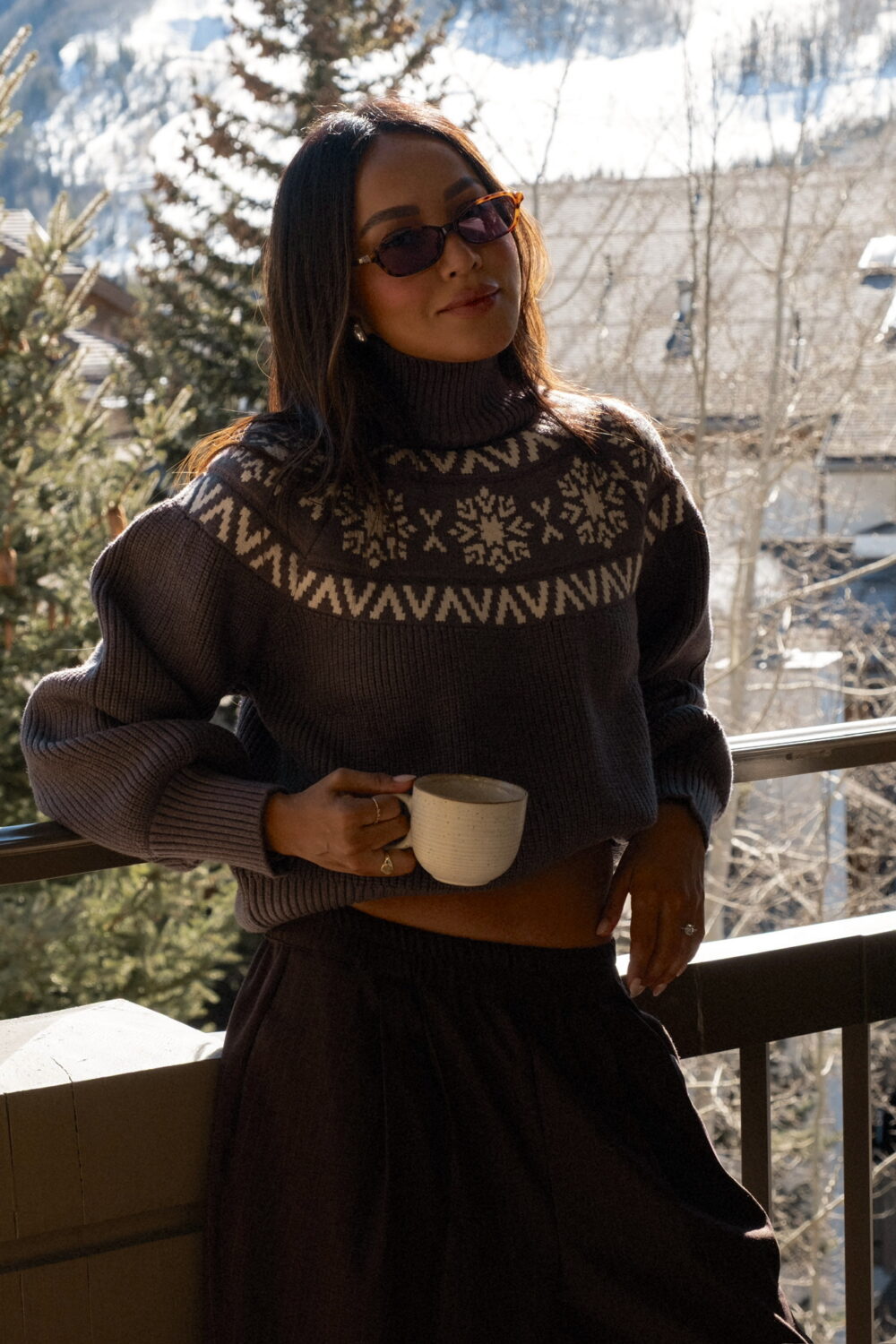 It’s also the perfect excuse to lean into a cozy but put-together look — something that feels as good as it looks. Think a soft turtleneck knit (even better with a subtle alpine feel), oversized trousers, and cozy snow boots. Add a statement faux fur coat to pull everything together, then finish it off with sleek sunnies and a few simple jewelry pieces. Easy, effortless, and perfect for a quick photo moment with the mountains in the background.
