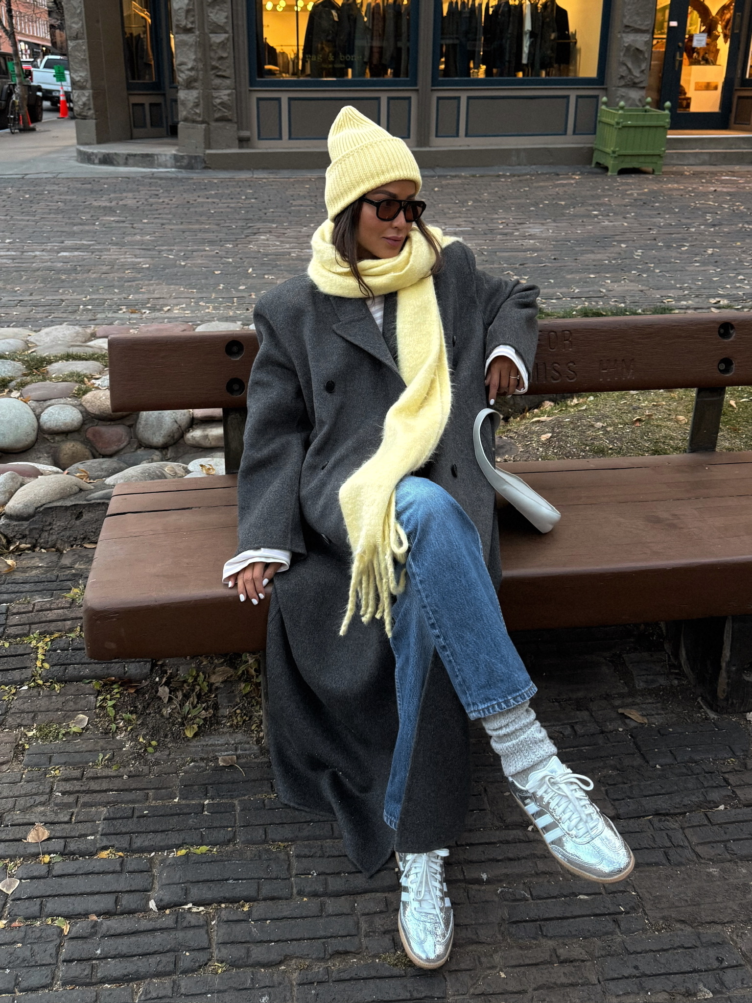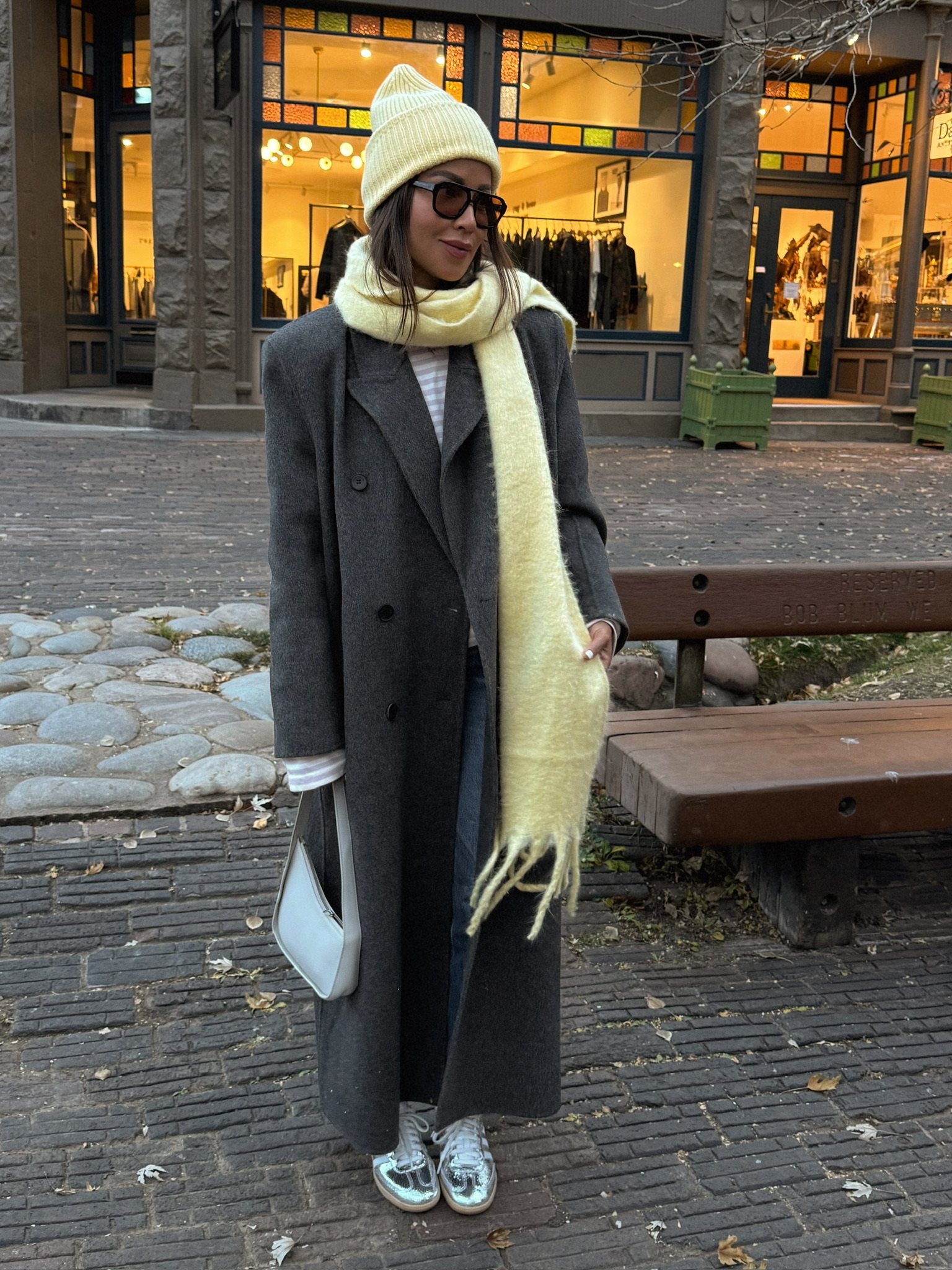 Whenever I’m there, I love taking full advantage of the chilly weather and dressing super cozy. Aspen temps call for warm layers and soft textures, so I reached for an oversized grey coat—my winter staple. I layered it over a simple long sleeve and added cozy accessories like a beanie and scarf to keep extra warm. Cute and practical!