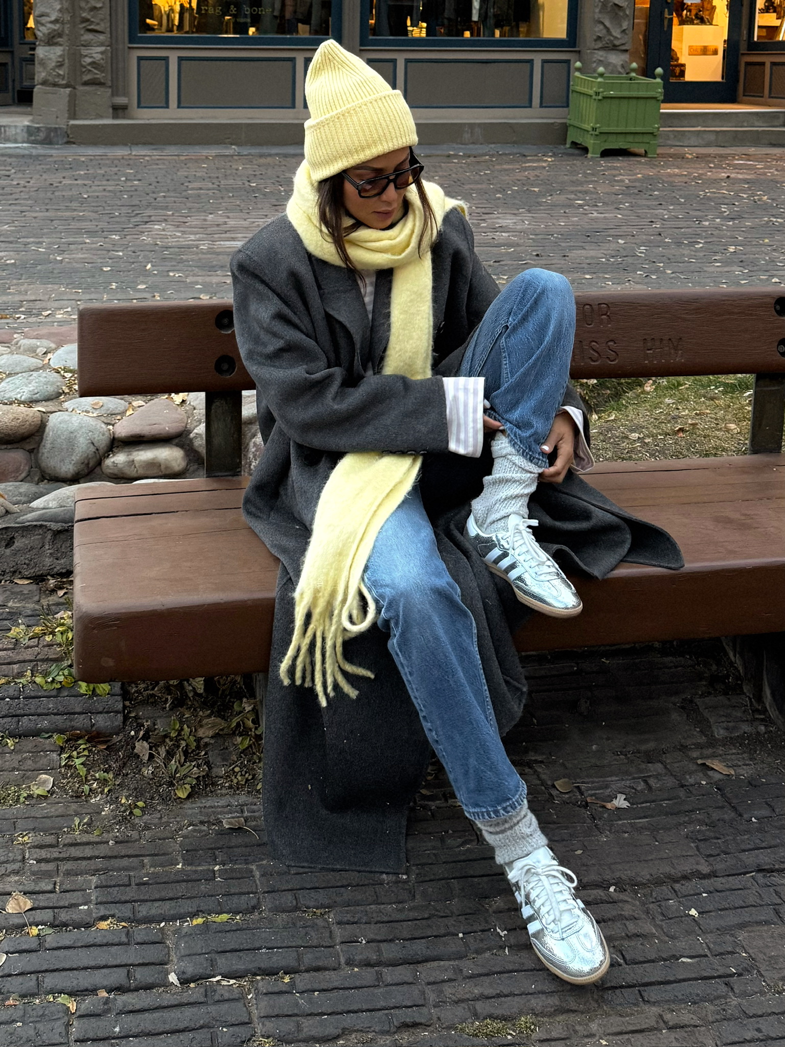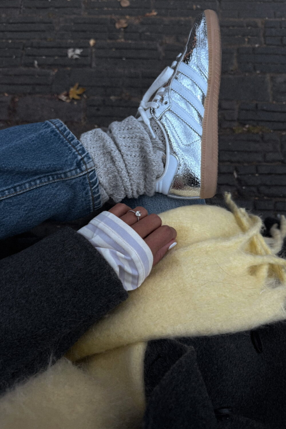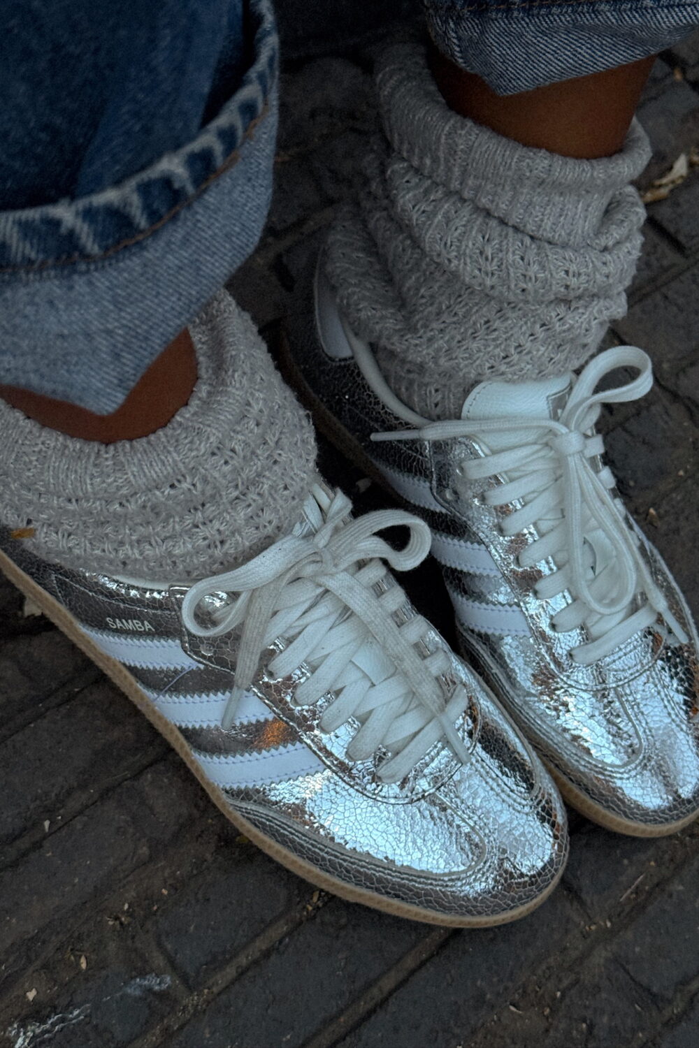To finish the look, I wore thick socks and these cool metallic Adidas sneakers I’ve been obsessed with. They’re comfy for walking around town but still add such a fun pop to a winter outfit.
