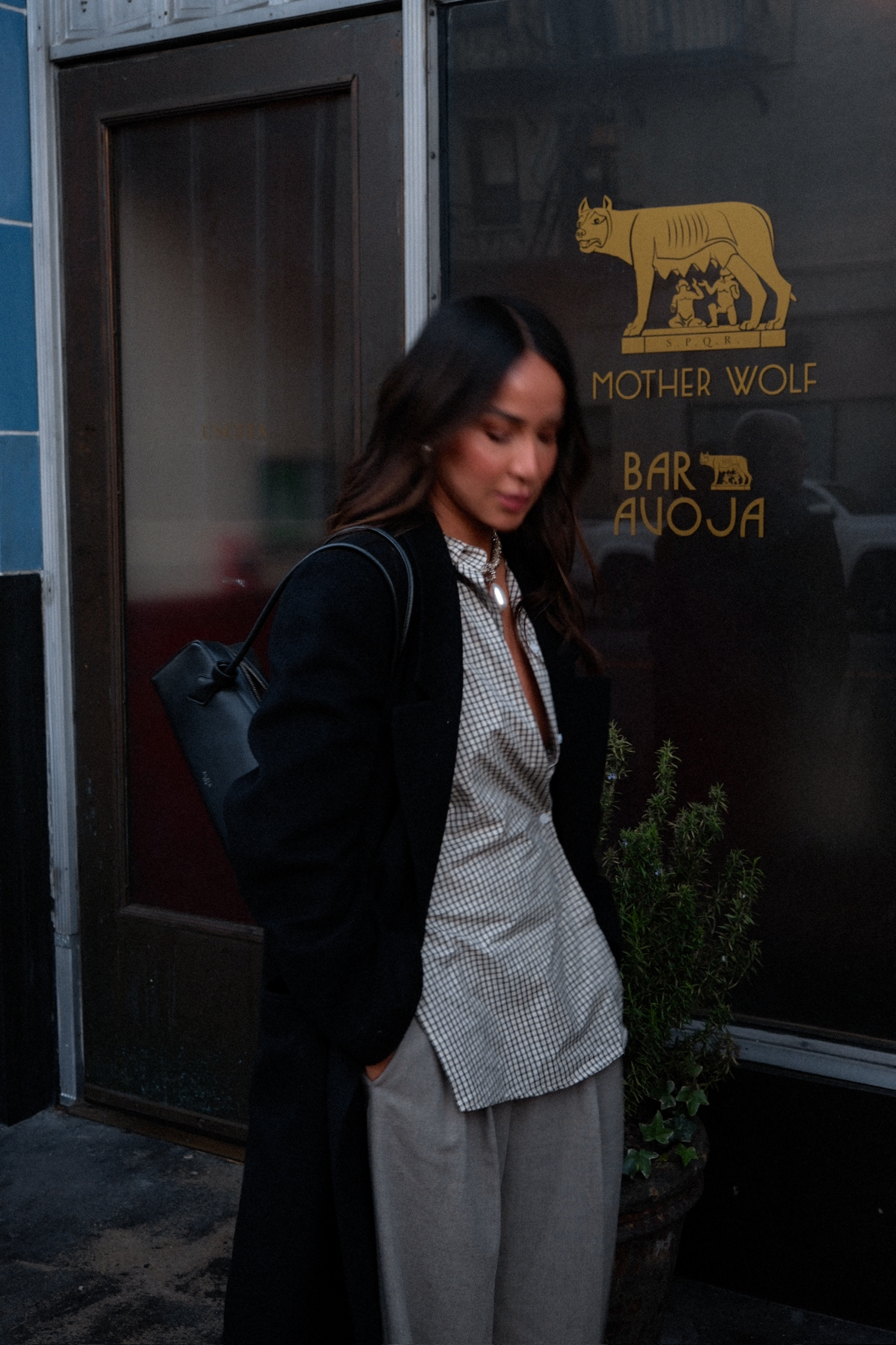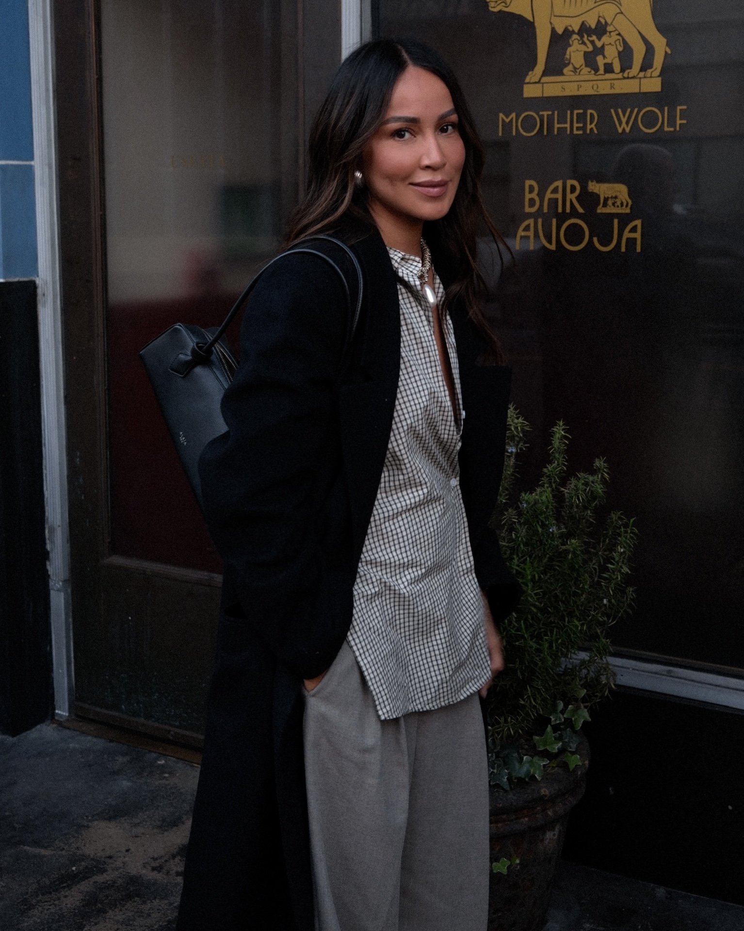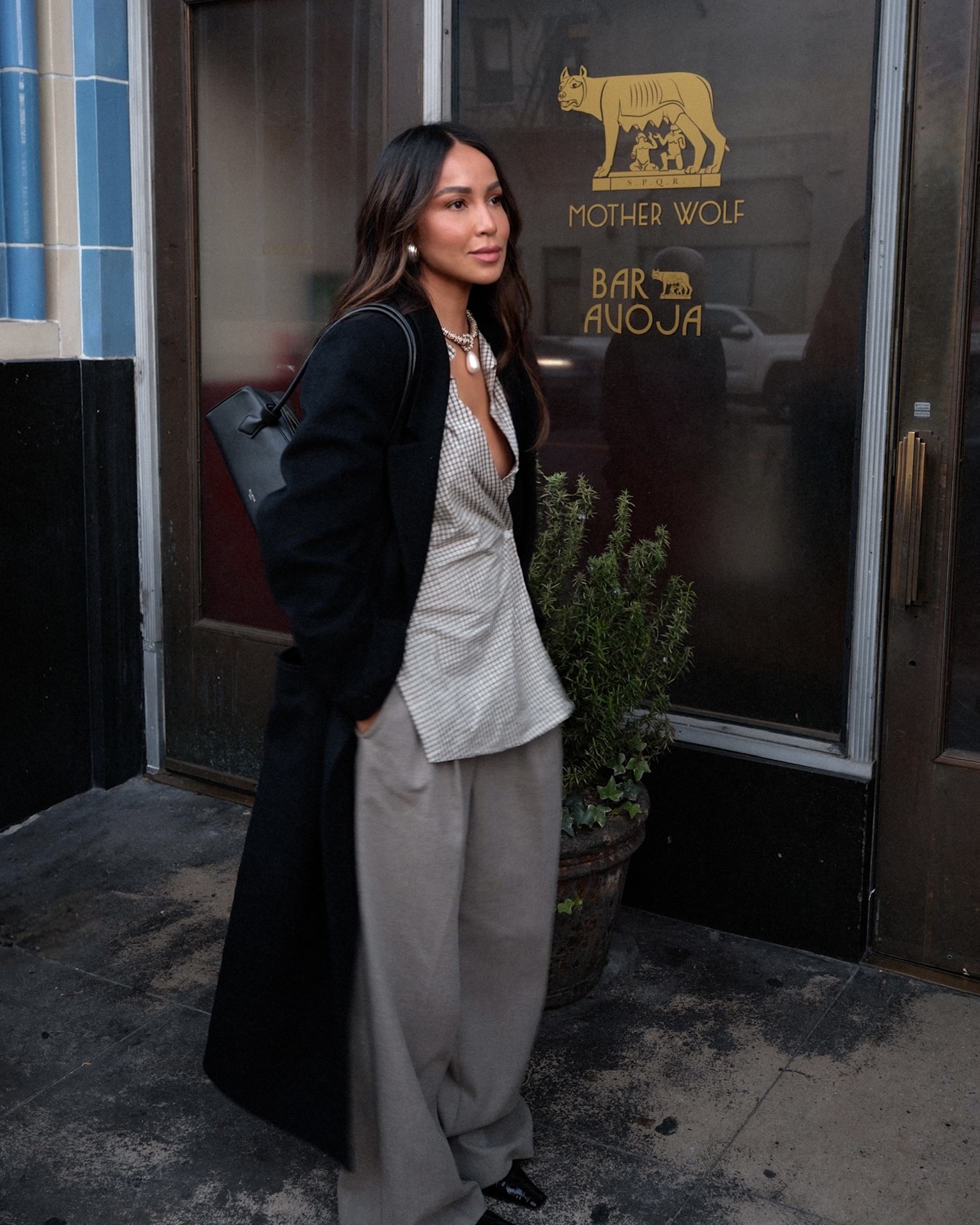 For this look, I went with an oversized checkered button-up and paired it with oversized trousers—one of my favorite combinations when I want something relaxed but still elevated. I layered it with a black coat and added a classic pointed boot, a baguette bag, and finished the look with a sparkly statement necklace to tie everything together.