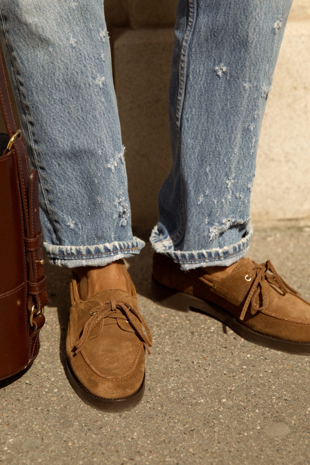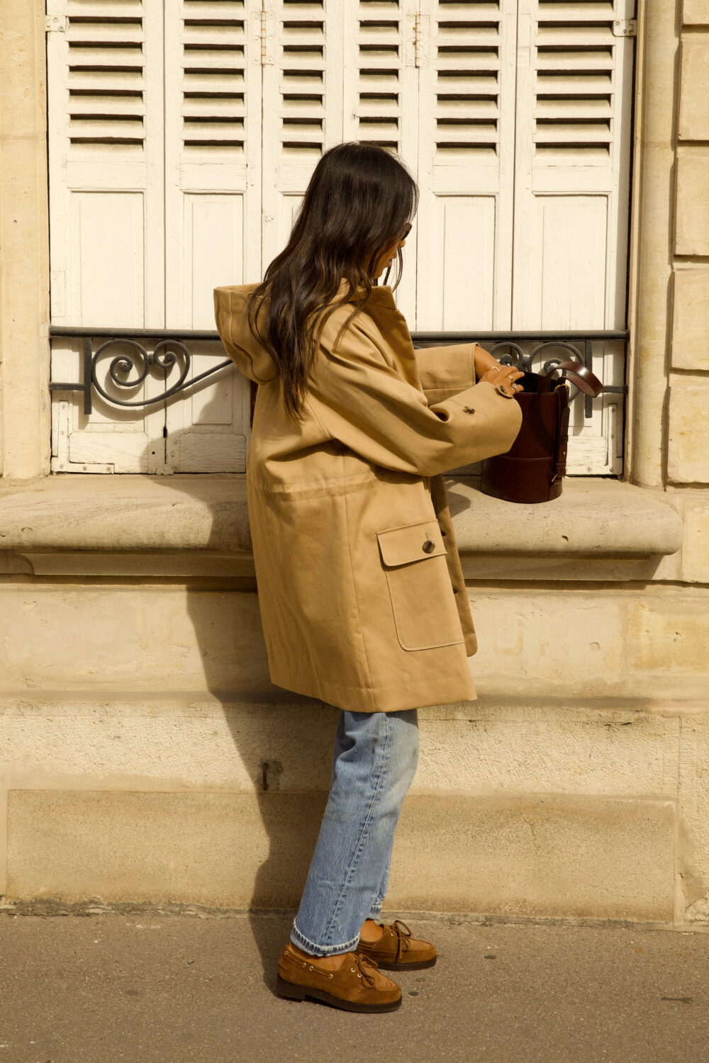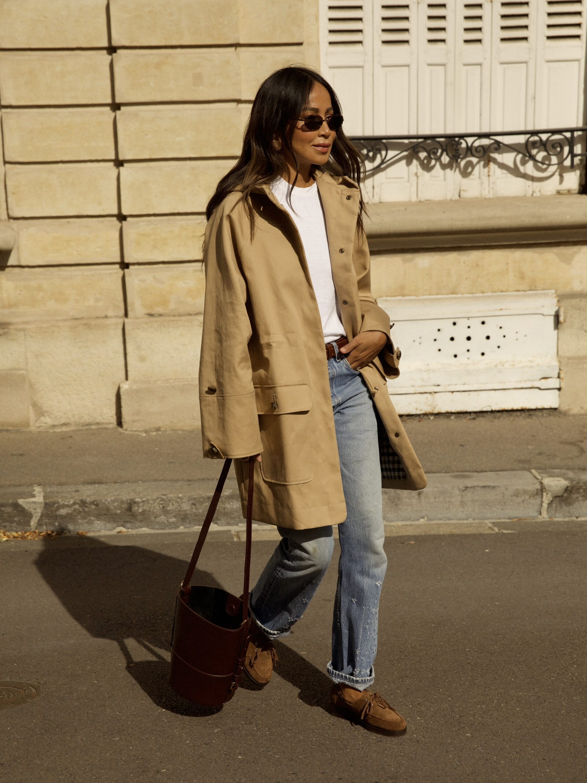A light trench, denim, a white tee, and loafers is my go-to look for those in-between days when it’s cooler than summer but not quite fall. It’s classic, comfortable, and easy to throw on.