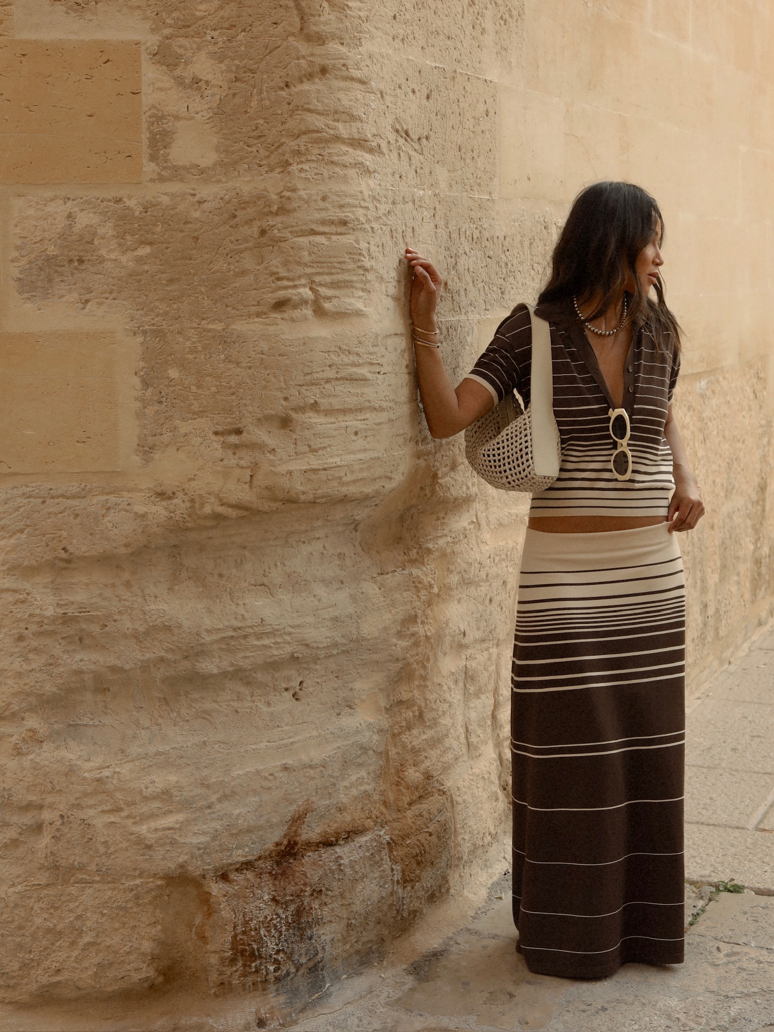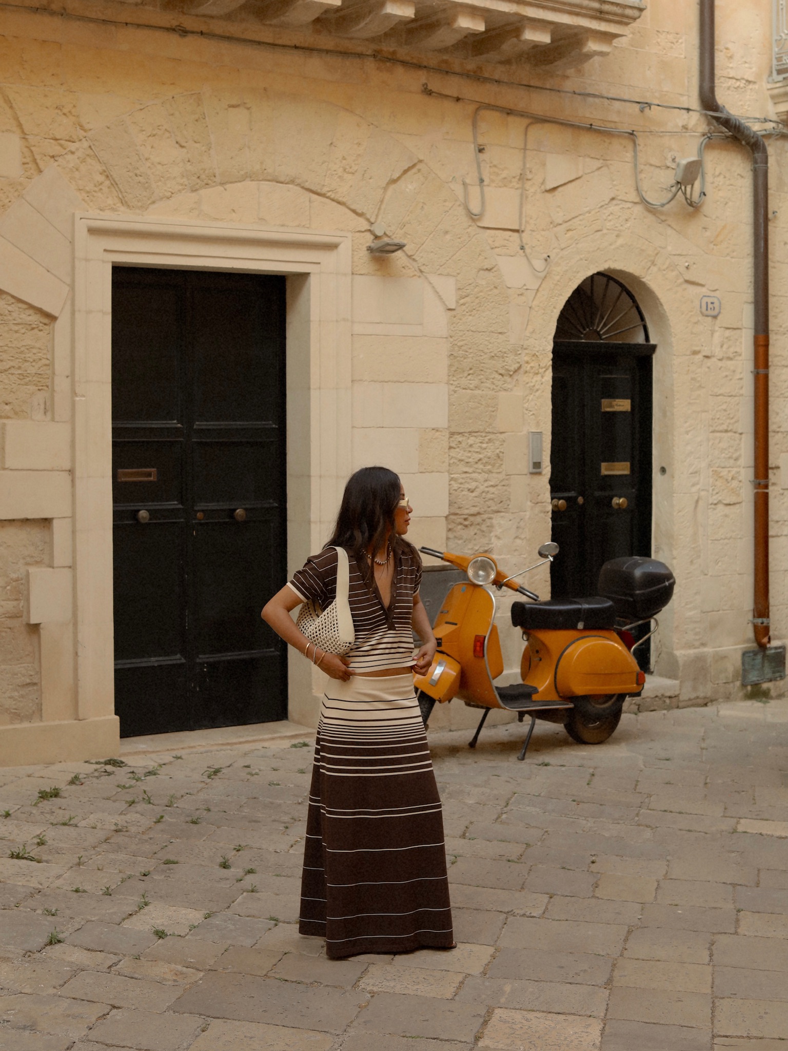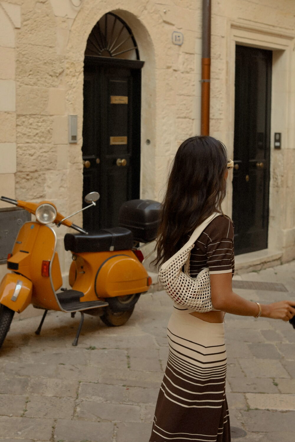 I slipped into this gorgeous set by Faithfull the Brand while wandering the charming streets of Lecce. The polo-inspired collar on the top gives it a playful twist, while the stripes tie the whole look together in a way that’s both classic and fresh. I kept the styling simple with a beaded necklace, statement earrings, and my trusty Christopher Esber clear sandals that seem to go with absolutely everything. Sunglasses and my St. Agni bag pulled it all together for an easy, elevated finish.