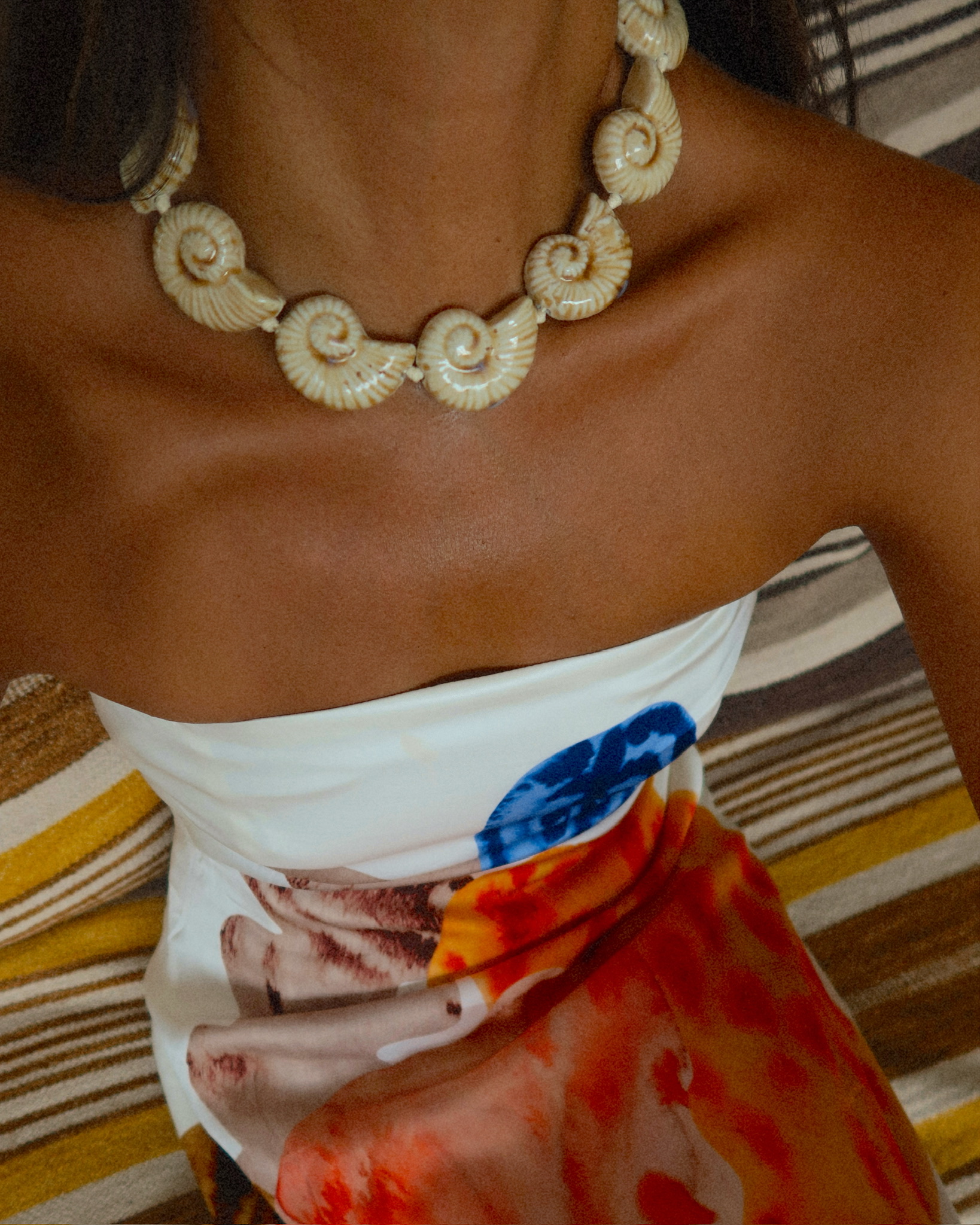There’s something so flattering about a tube-top dress with a statement necklace, it highlights the neckline and gives the whole look a relaxed, beachy vibe.