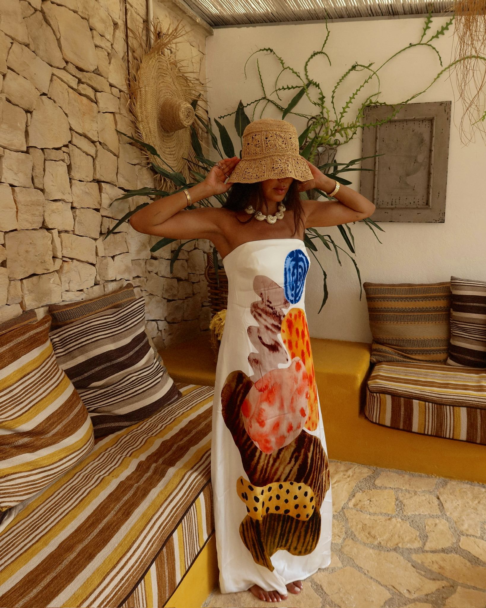 Lately, I’ve been all about pairing bold statement pieces, like this stunning maxi from The Wolf Gang—with casual elements: flip flops, a straw bucket hat, and even air-dried hair. It creates that effortless vibe I love, but still feels pulled together in that “didn’t try too hard” way.