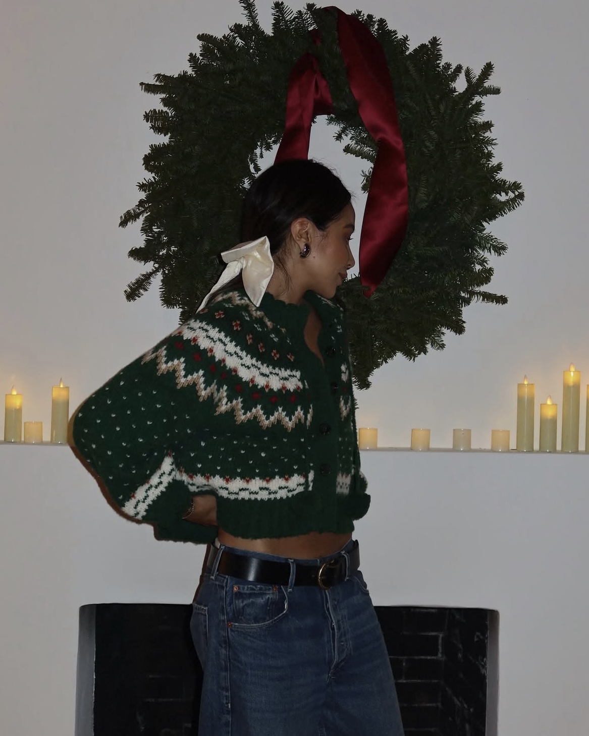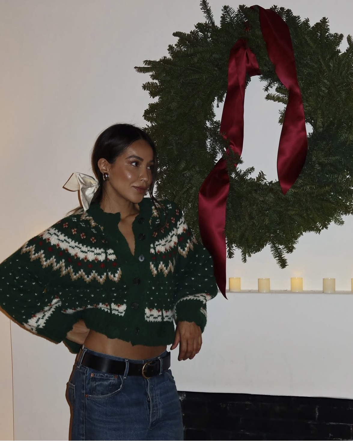 Sometimes the coziest outfit is all you need for a Christmas Eve party. My go-to: an “ugly” (but actually cute) Christmas sweater paired with denim and a pair of pretty heels to elevate the look. If you’re worried it feels too casual, dress it up with bold accessories like chandelier earrings or a sparkly statement necklace.