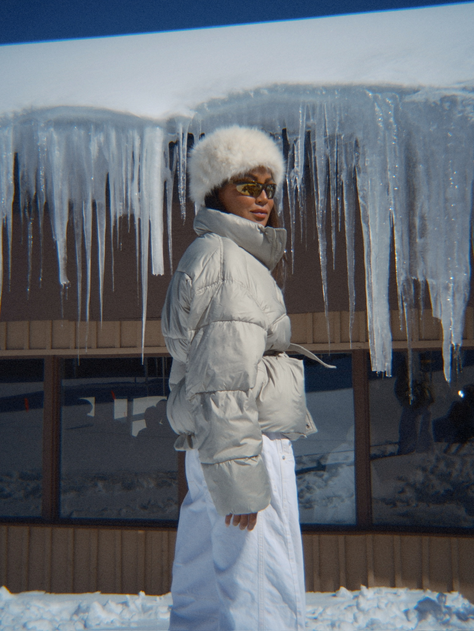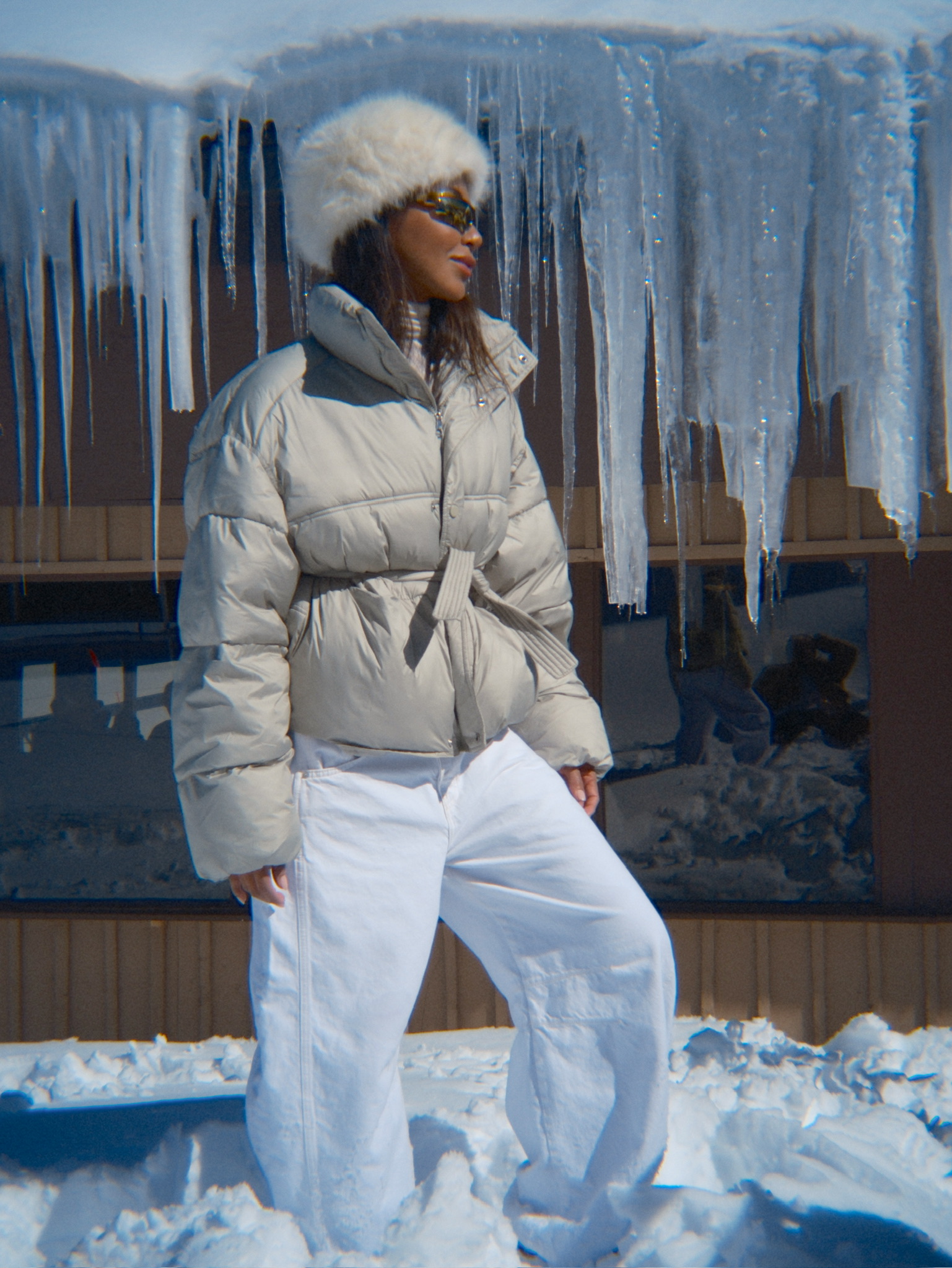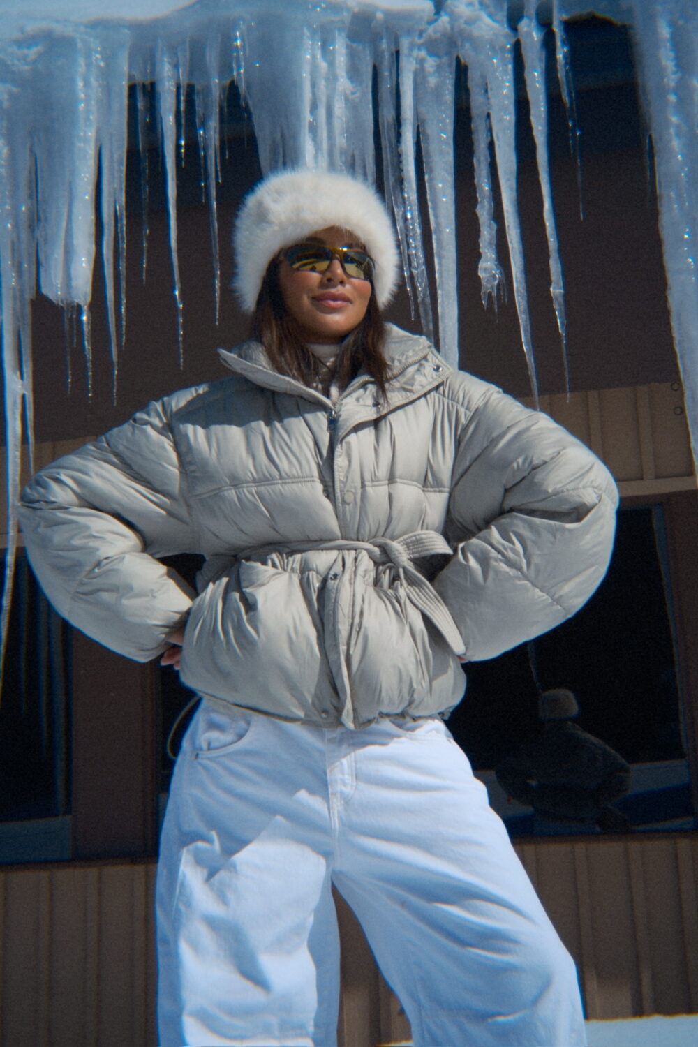 For my look, I started with a soft white turtleneck and layered a cream puffer on top. I love how these tones play together — it feels warm, cozy, and still super chic. I paired it with oversized white denim (pro tip: layer leggings underneath for extra warmth), and for shoes, I went with these brown Moonboots that I’m obsessed with, they add the perfect contrast.
