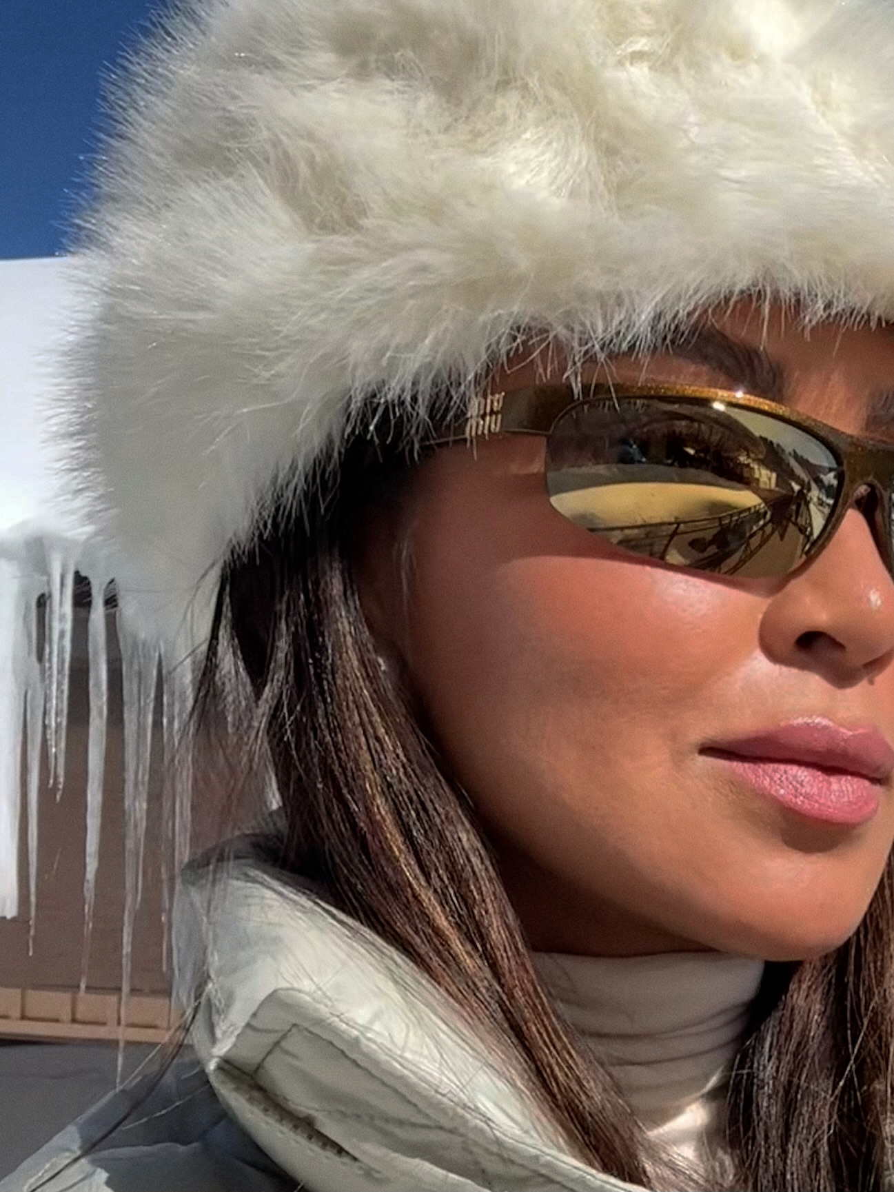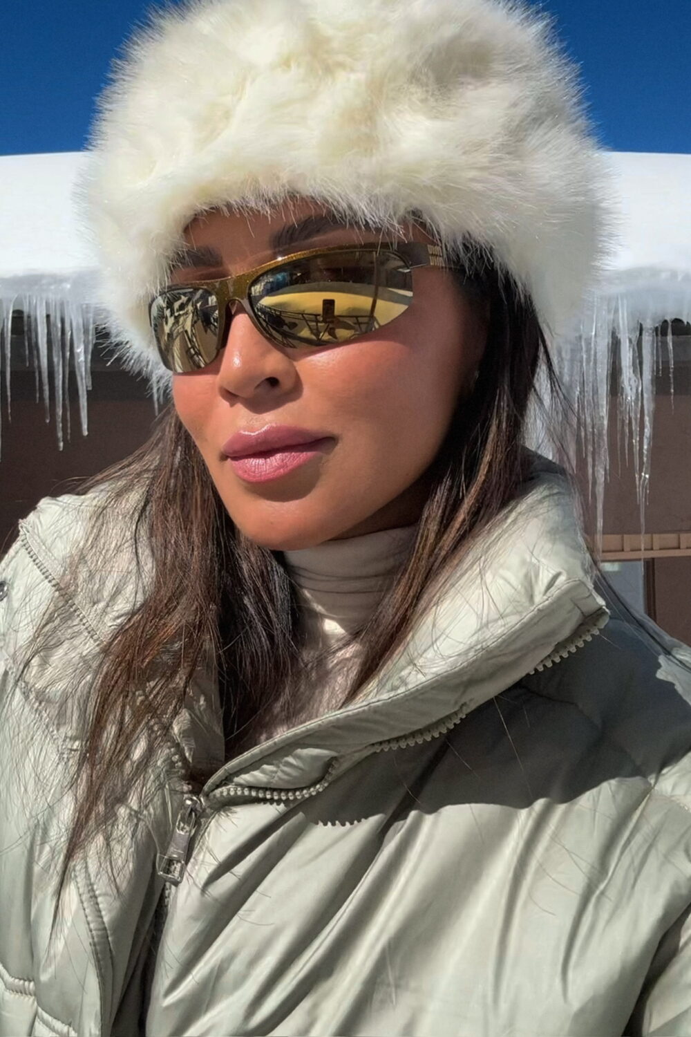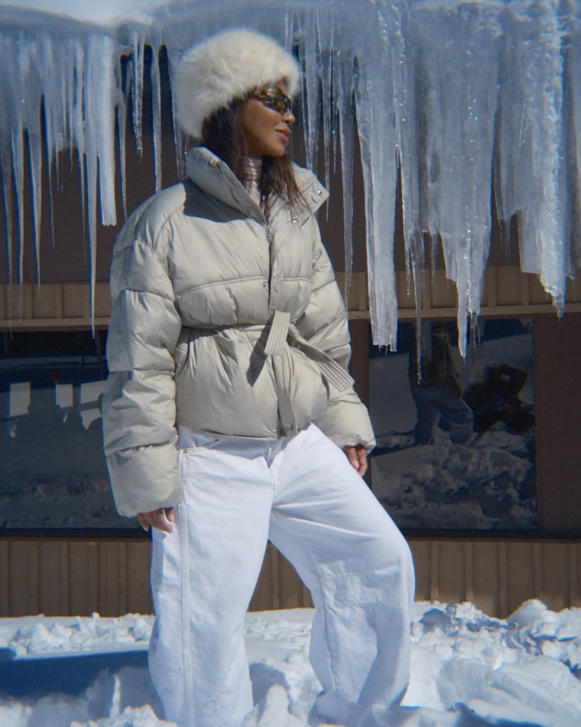 For my look, I started with a soft white turtleneck and layered a cream puffer on top. I love how these tones play together — it feels warm, cozy, and still super chic. I paired it with oversized white denim (pro tip: layer leggings underneath for extra warmth), and for shoes, I went with these brown Moonboots that I’m obsessed with, they add the perfect contrast.