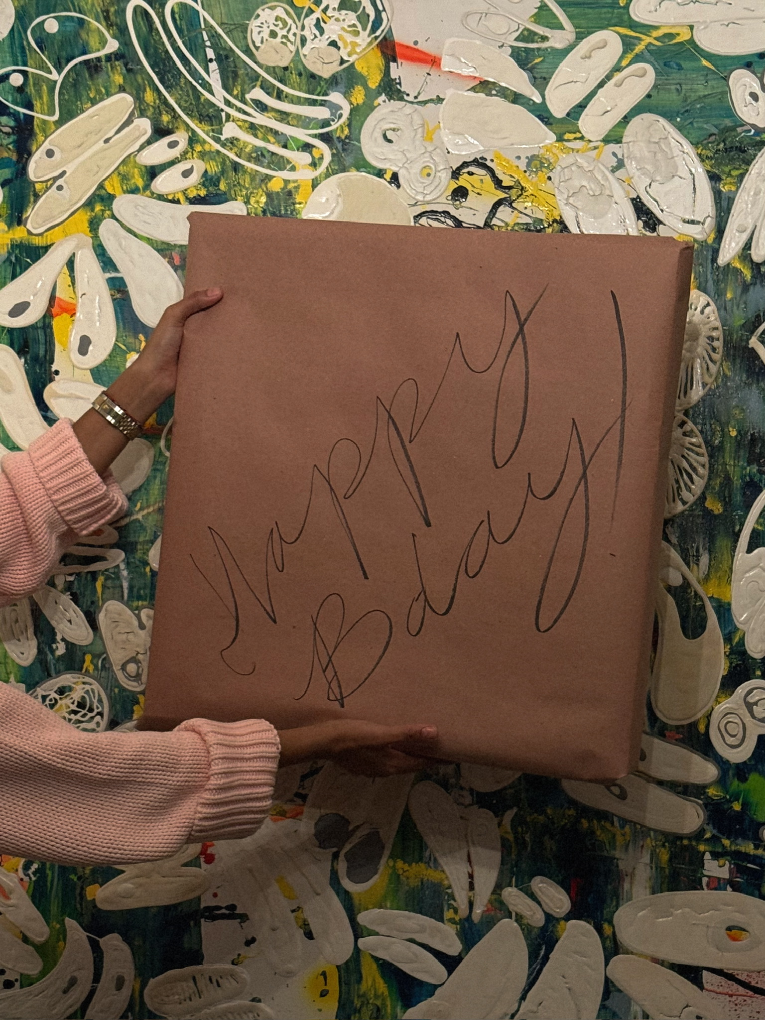 A birthday gift from my brother, photographed in front of his artwork — gift reveal in the next photo. I’ve really started to appreciate art more lately and love collecting pieces that feel meaningful.