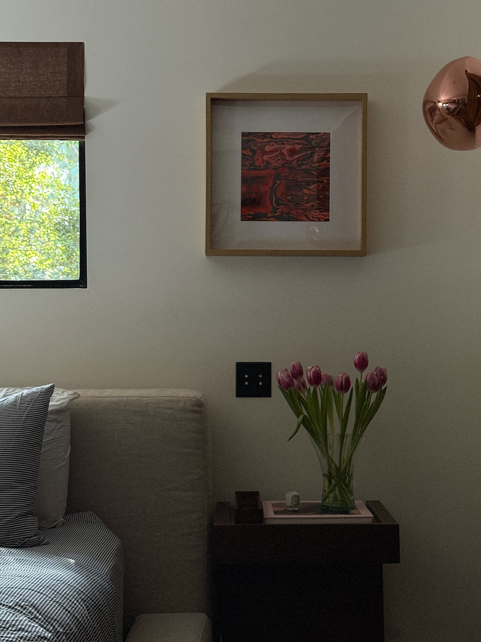 My favorite corner of our bedroom. I love having fresh blooms each week, and the artwork my brother gifted me makes it even more special. Interior design has always been a passion of mine — I love refreshing a space and mixing textures. Right now, I’m loving the warmth of wood cabinetry next to this upholstered headboard.