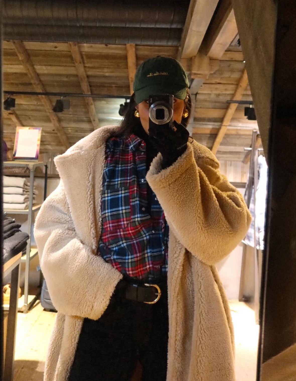I LOVE big, cozy, teddy bear-like coats! They seriously make winter outfits so much cozier and more elevated. I styled mine with a plaid button-up, black jeans, a belt, and a baseball cap to tie it all together. You can shop similar items here.