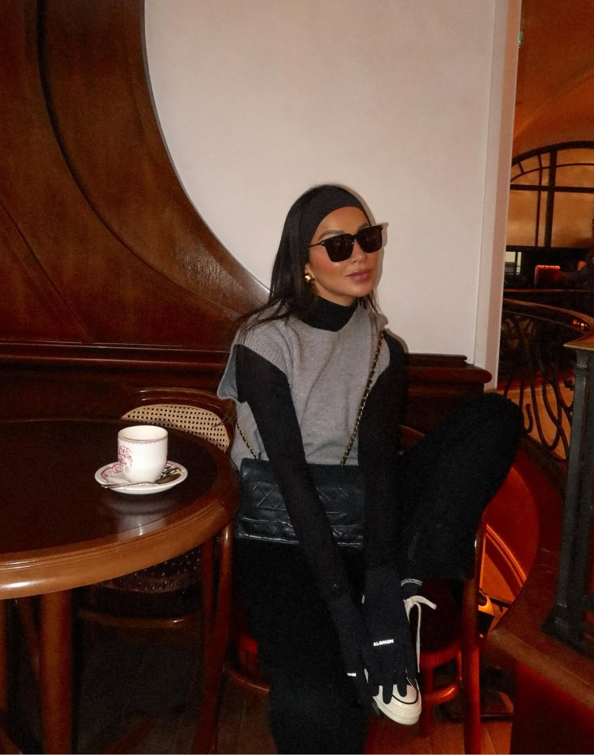 A little après-ski moment. This was my go-to look after skiing — leggings under my snow pants, a sleek turtleneck, and a knit vest. I threw on a bandana and some sunnies for a bit of polish. Cozy, simple, and perfect with a hot cocoa in hand.